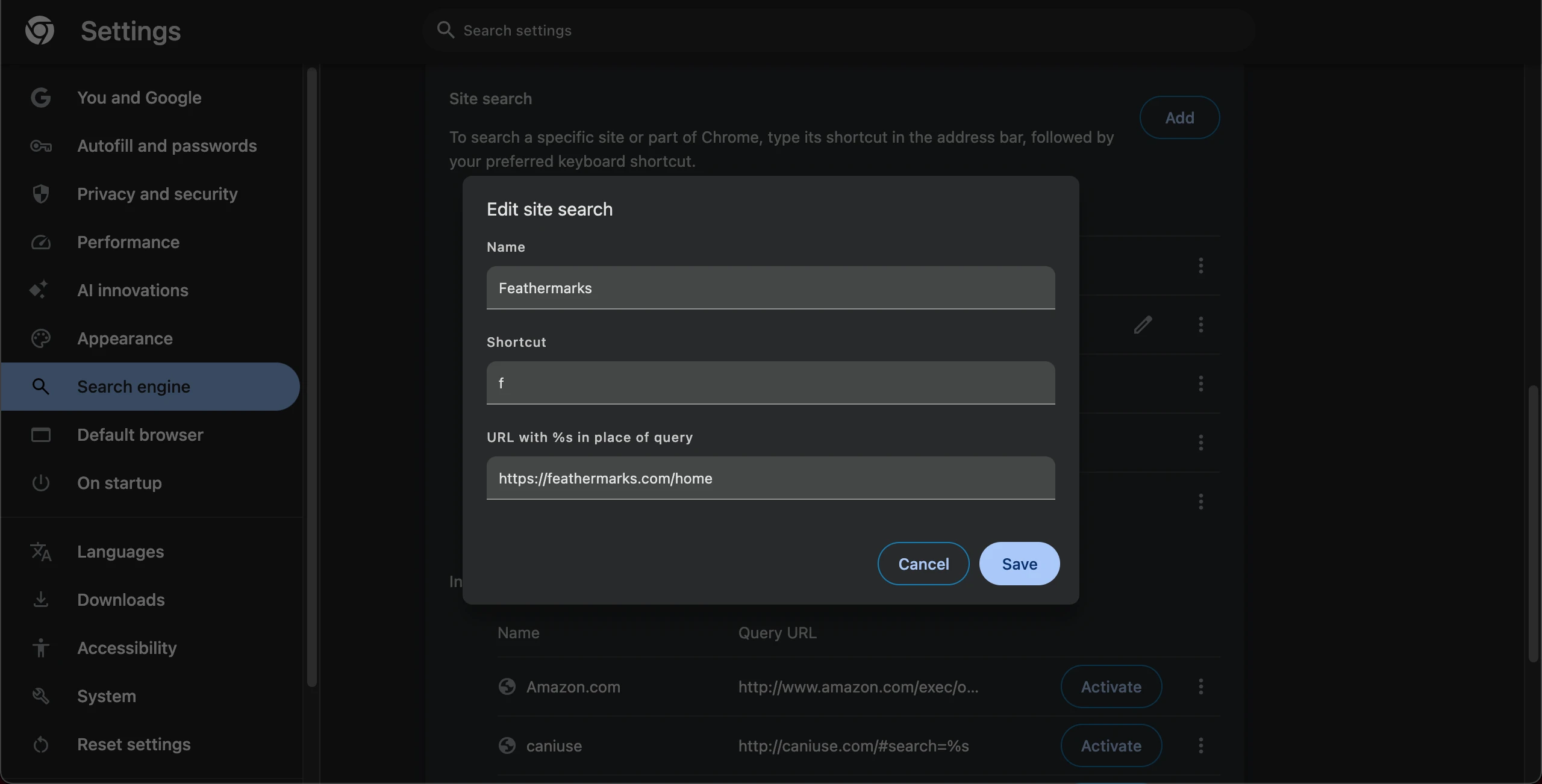 For the Name enter Feathermarks, for the shortcut, enter f, and for the url enter https://feathermarks.com/home. Next click Save