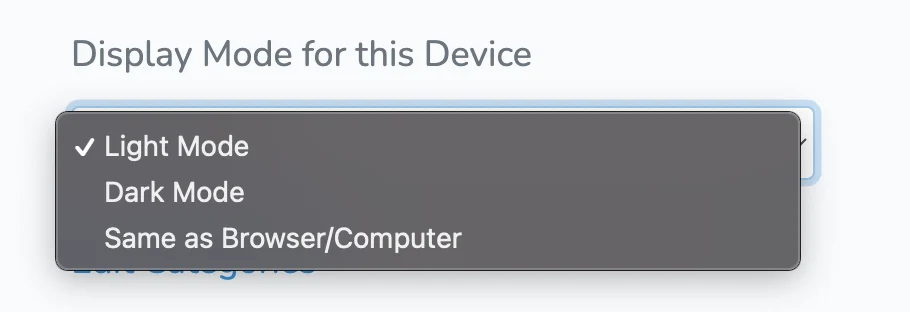 Open your account settings page at feathermarks.com/settings. Scroll down until you see the section titled Display Mode for this Device. Choose the third option called Same as Browser/Computer. That's it! Now your phone and your bookmarking tool will dynamically change their color scheme to match the time of day. Happy web surfing! 🏄