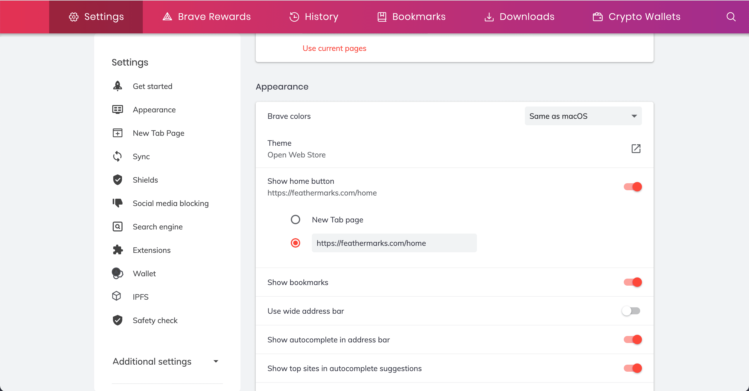 First you'll need to navigate to your settings page. Look for the icon on the upper right side of the browser and click Settings, or copy and paste brave://settings/ into a new browser tab. Once you are on the settings page, scroll down until you see the 'Show home button' in the 'Appearance' section. You'll need to turn this setting to 'On' and set the homepage to https://feathermarks.com/home in order for the next steps to work correctly.