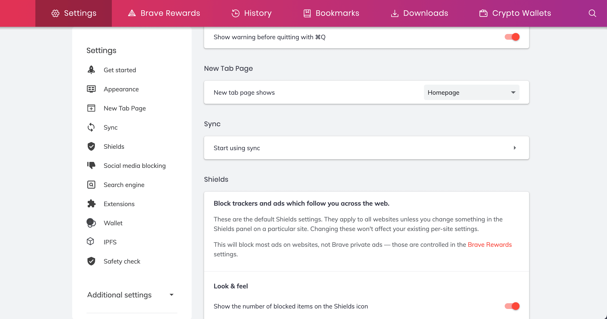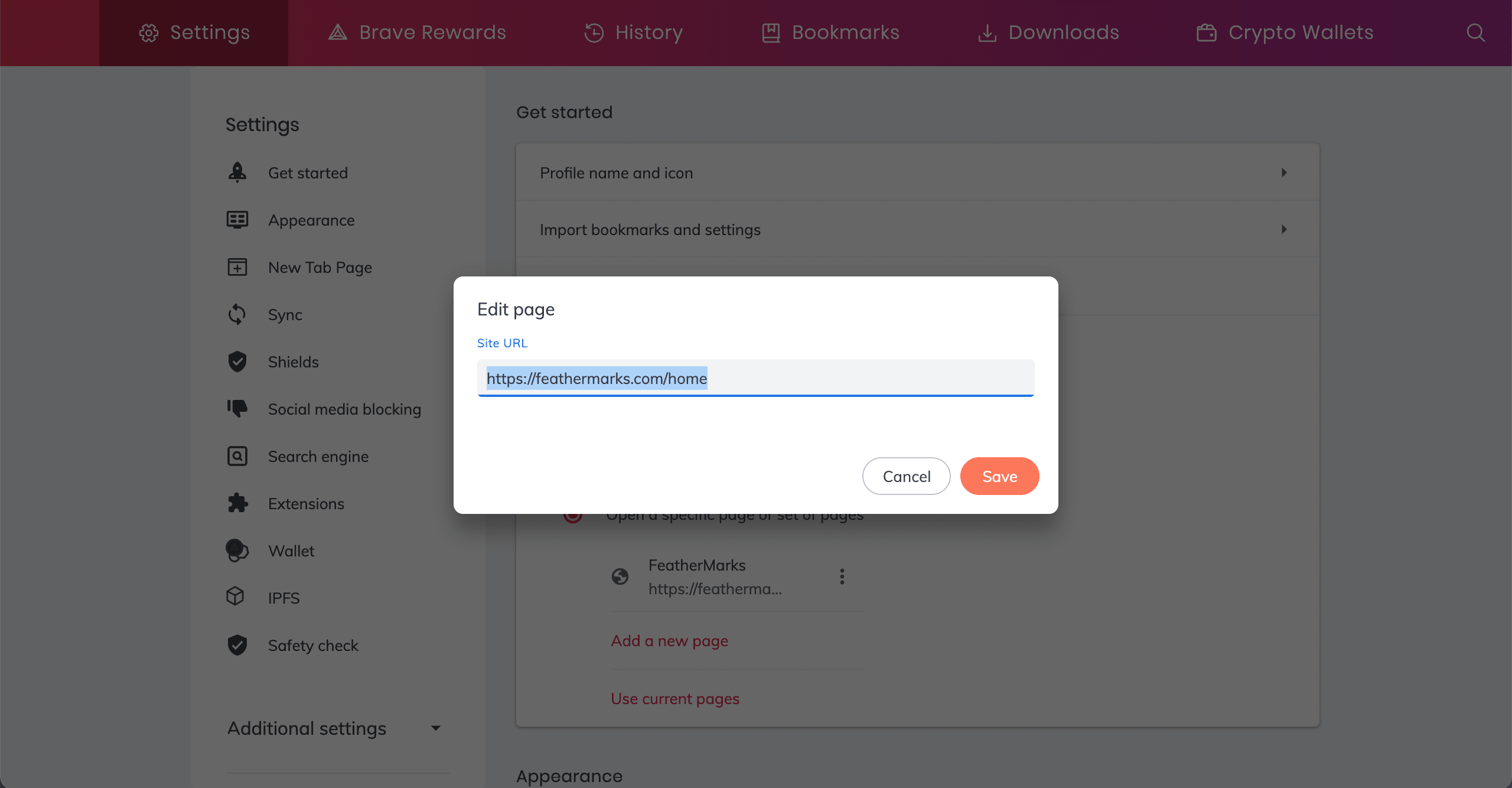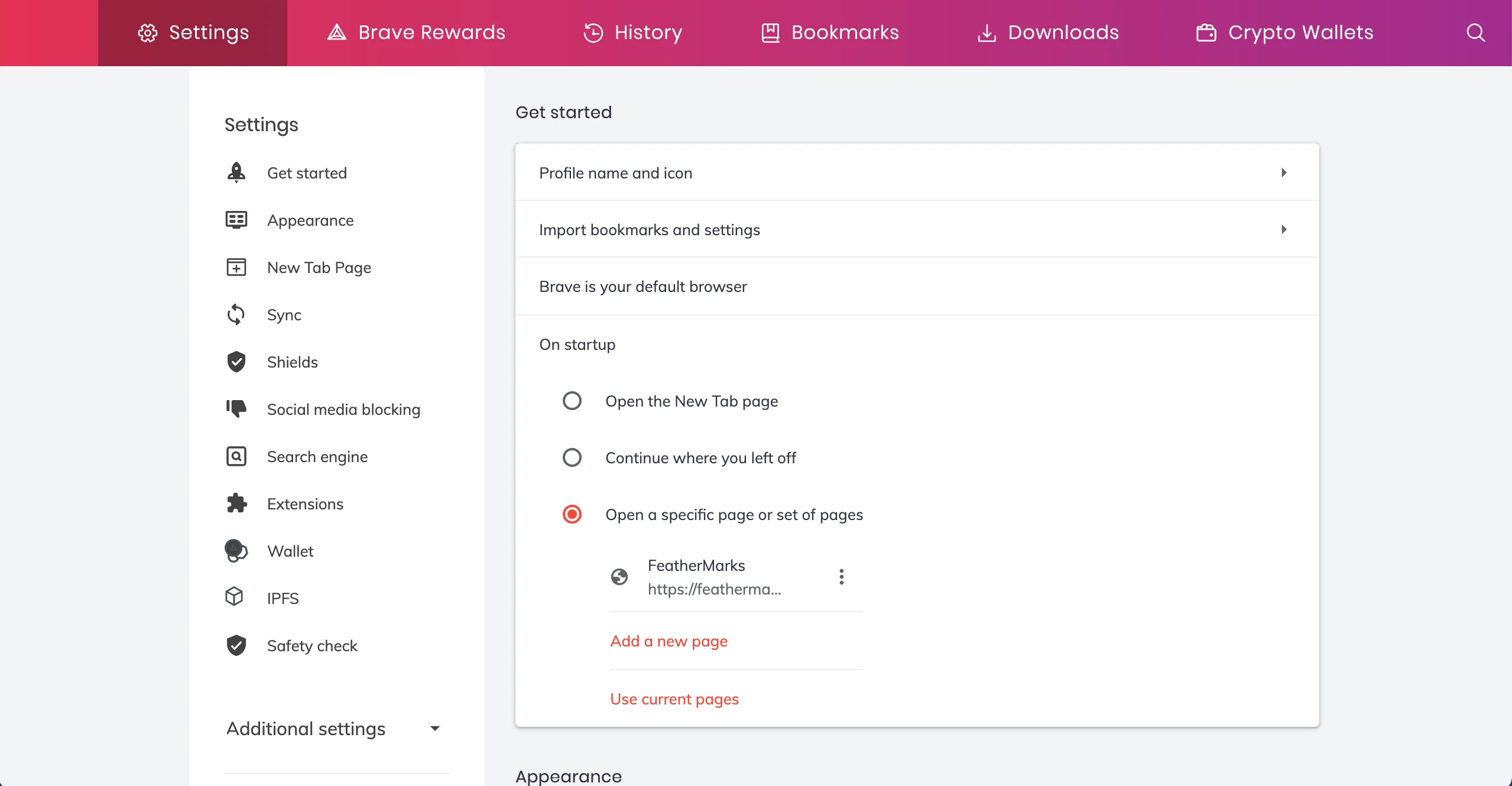 While on the Settings page, you can also set Brave to open Feathermarks.com when the browser first starts up. To set this, look for the 'On startup' option in the 'Get Started' section.